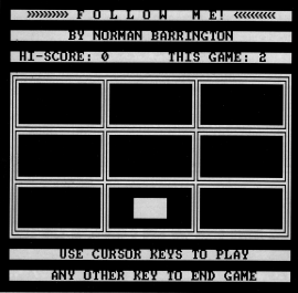 FOLLOW ME is the kind of basic game that becomes addictive, not just because of its playability and superior use of sound, but because it does so much with so few lines of code.