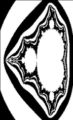 Ersetzt man die IF-Zeile durch die in (* *) geklammerte Zeile, so wird nicht nur das Apfelmännchen gezeichnet, sondern noch zusätzlich seine Umgebung nach verschiedener Divergenzgeschwindigkeit strukturiert (Farbe wäre hier eine wertvolle Bereicherung).