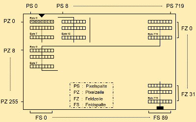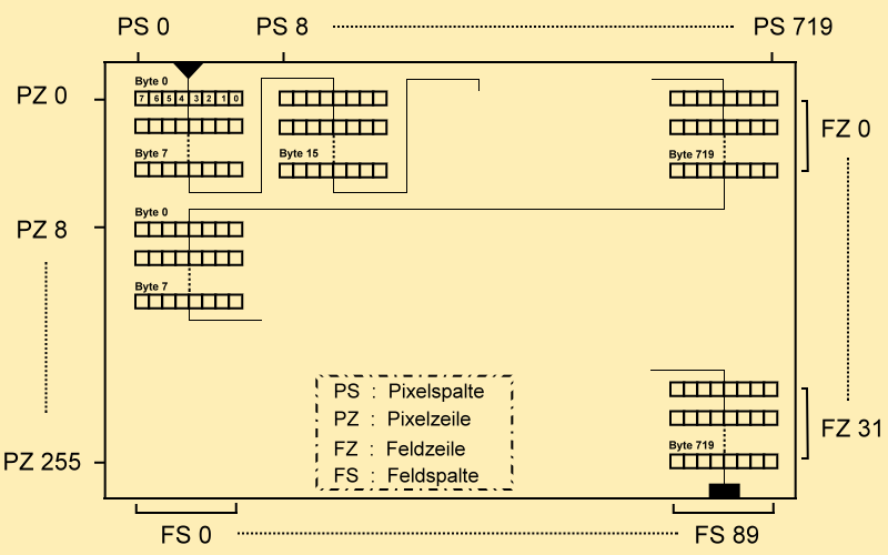 In horizontaler Richtung codiert das adressierte Byte acht Pixel (links beginnend). Alle acht Bytes weiter im Bildschirmspeicher folgt die Adresse für die rechts anschließenden Pixel.