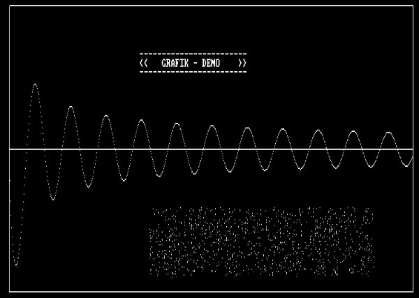 Listing 4 ist ein kurzes Turbo-Pascal-Demo-Programm. Die Adresse für die "external procedure" (F230H) gibt GRAF.COM bei Aufruf an. Sie muß bei geänderter Speicherkonfiguration (zum Beispiel mehrere RSX) angepaßt werden. Um 'wilde' Aufrufe, die mit großer Wahrscheinlichkeit ins 'land of no return' führen, zu vermeiden, empfiehlt es sich, eine Prüfprozedur (procedure memtest in demo.pas) am Anfang einzubinden. Bei erfolgreicher Installation von GRAF.COM und Compilierung/Start von DEMO.PAS sollte Abb. 6 auf dem Bildschirm erscheinen. Mit RSXOFF.Z80 (Listing 5) kann die Grafikroutine aus dem Speicher wieder herausgenommen werden. Der TPA wird um die letzte RSX angehoben. Alte und neue TPA-Grenzen werden angezeigt. Zusammengefaßt das Vorgehen zum Übersetzen der Quelltexte: