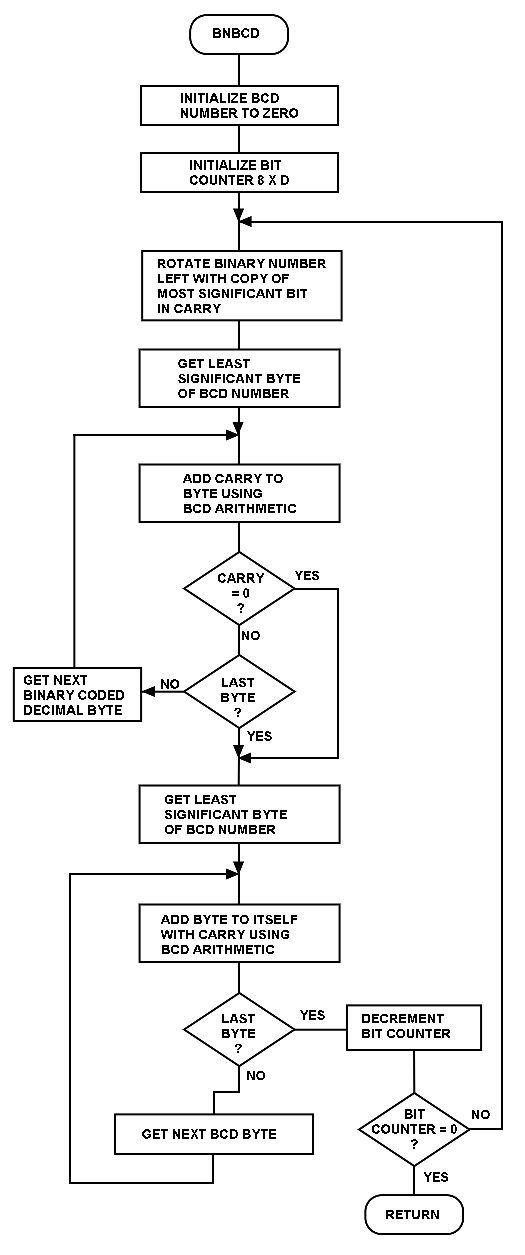 Flowchart of the algorithm for the binary to binary-coded-decimal (BCD) conversion subroutine.
