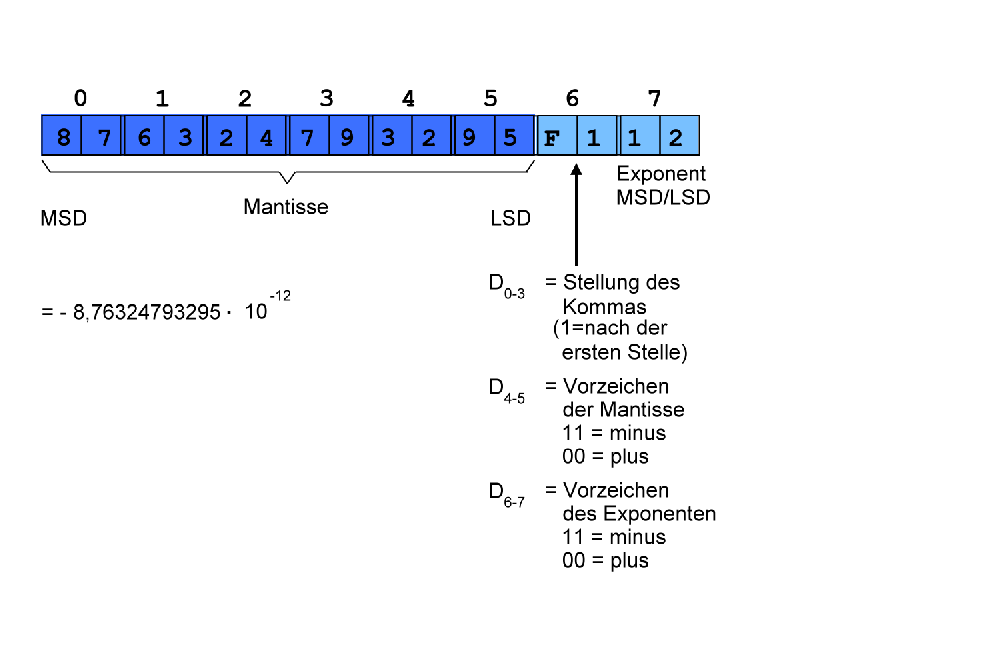 Sie verarbeiten Dezimalzahlen mit 12stelliger Mantisse und 2stelligem Exponenten (Bild 1 zeigt das Format).