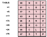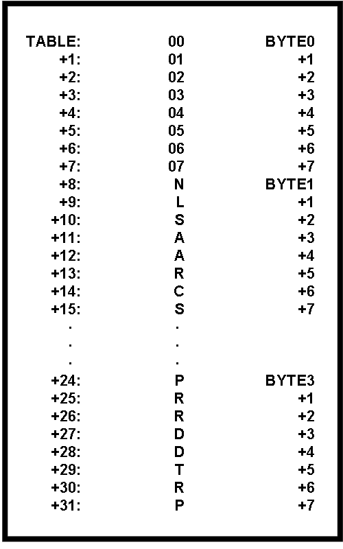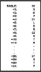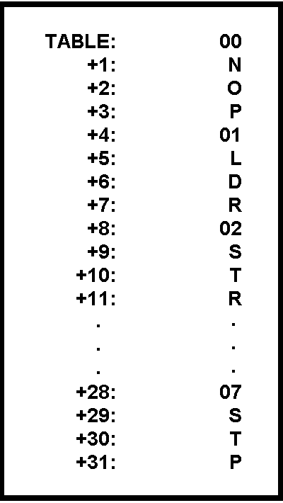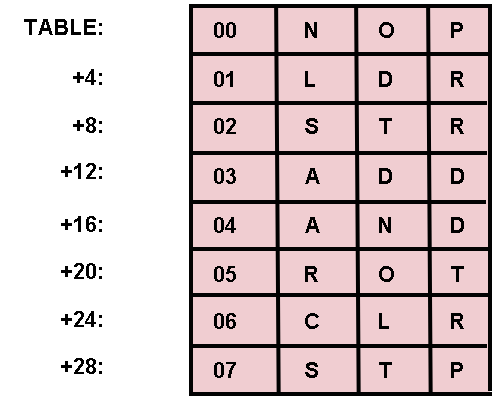 TABLE, is created with eight 4 byte entries, and the mnemonic and value for each opcode is placed in the table entry whose address is found by multiplying the rightmost three bits of the opcode by four and adding the results to the base address of the table, then a simple subroutine can calculate the precise location of any entry.