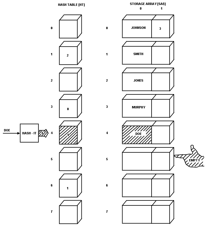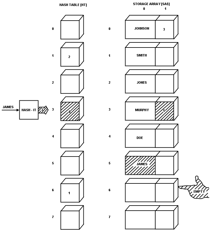 The numbered location pointed to by EMPTY was then stored in the HASH TABLE at location 3.