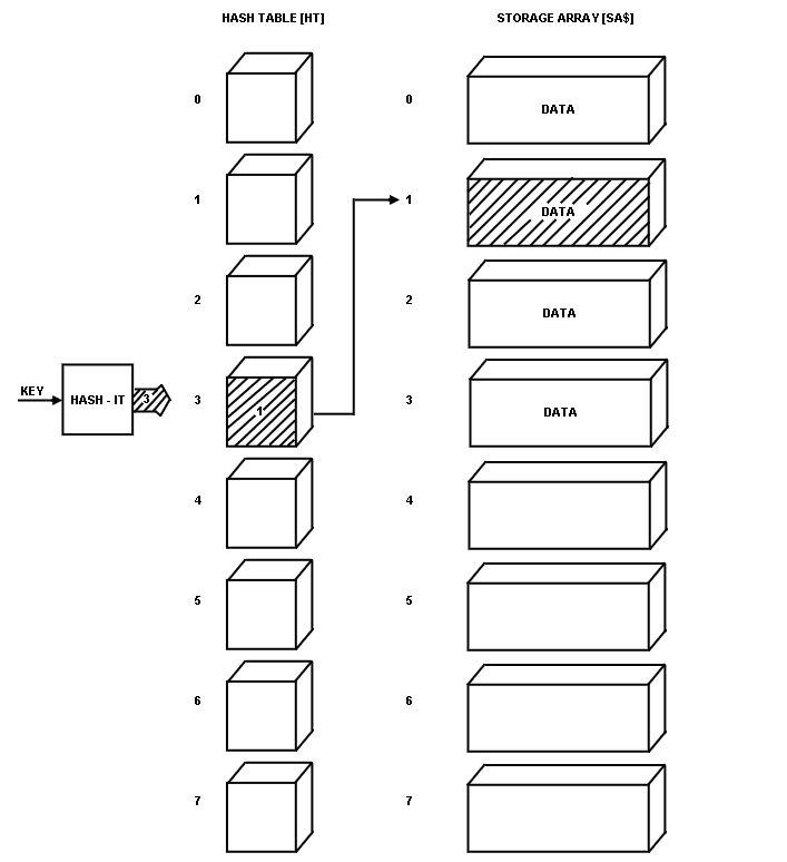 In turn, the contents of each element of the HASH TABLE point to an element of the STORAGE ARRAY (SA$), which holds the data and their respective KEYS (see