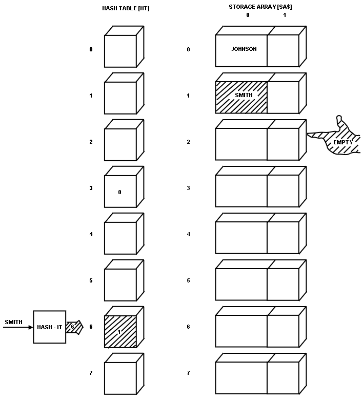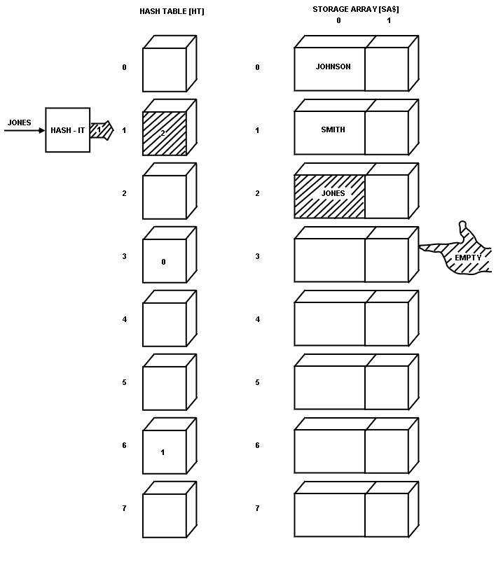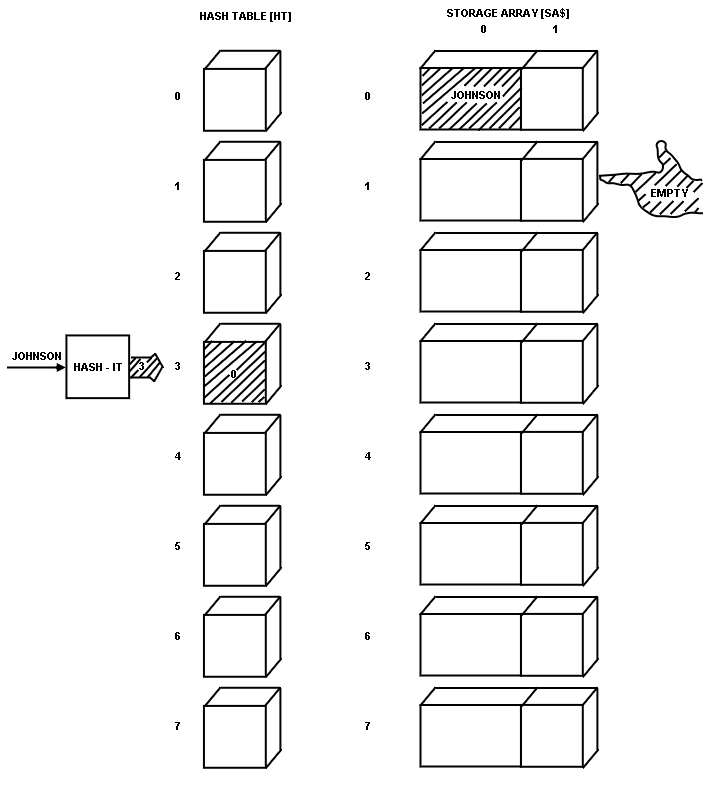 So I stored the value pointed to by EMPTY in the second row of the STORAGE ARRAY element containing JOHNSON.