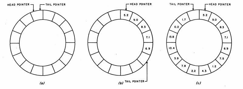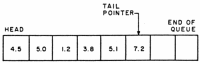 The circular queue, figure 2, is also represented as a special purpose one-dimensional array.