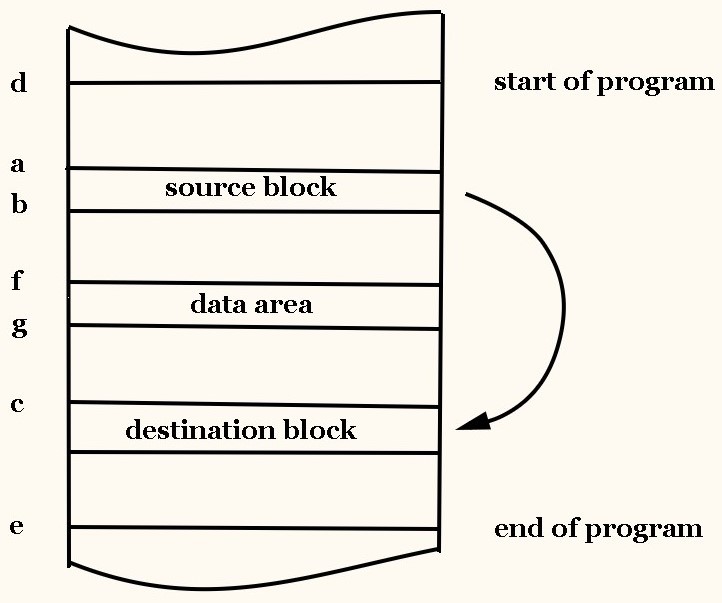 In a program residing from location d to location e, a block starting at a and eriding at b is to be moved to location c.