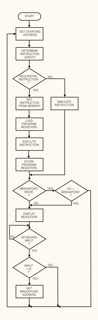 If in breakpoint mode, and the program count does not equal the breakpoint address, the simulator jumps back to the beginning and executes the next instruction.