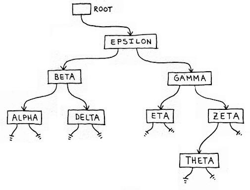 In ähnlicher Weise enthalten die rechten Zeiger den Verweis auf einen Unterbaum, dessen Symbole alphabetisch alle größer (aufsteigend) sind als das Symbol im Knoten.
