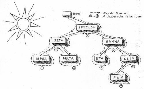 Aufgrund der Art, wie der Baum angeordnet ist, können wir einen eleganten Algorithmus benutzen, der wie folgt funktioniert: