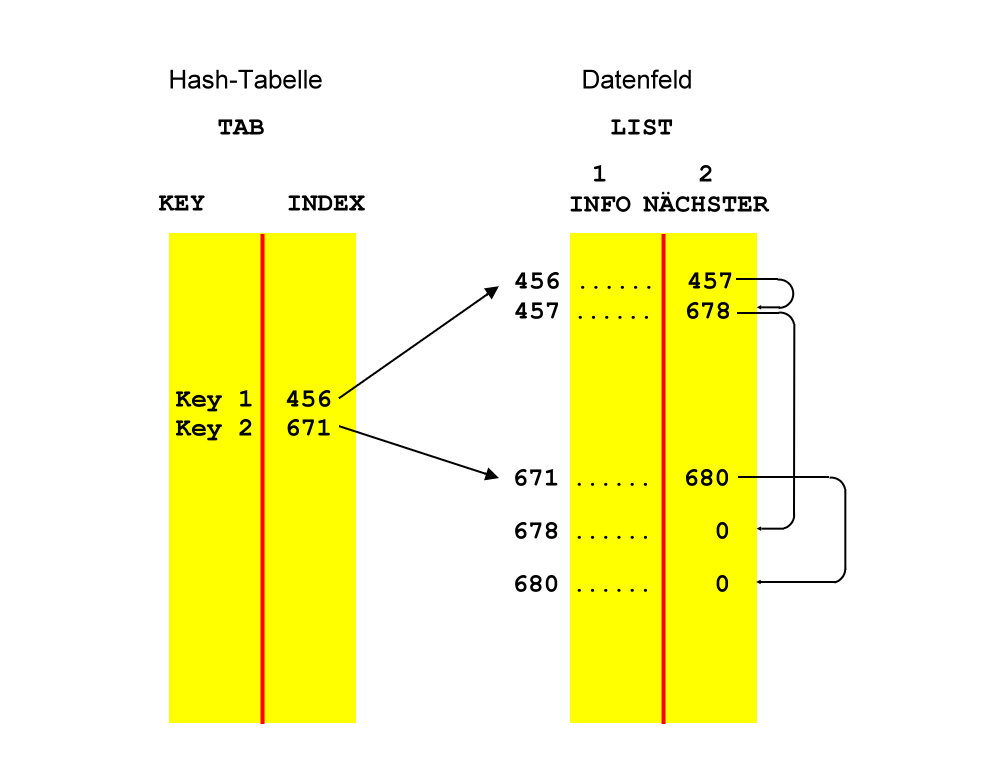 - Alle Überläufe, das heißt alle Schlüssel, für die der Listenplatz T[H(KEY)] schon belegt ist, werden in einem Feld außerhalb der Tabelle gespeichert.