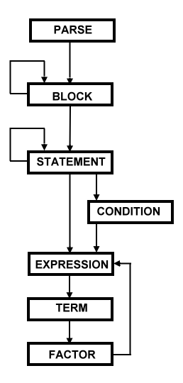 Die Aufrufbeziehungen der Unterprogramme im Parser spiegeln die Struktur der EBNF-DEfinition von DOIT wider und sind hier noch einmal skizziert.