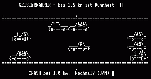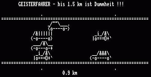 Geisterfahrer Geisterfahrer ist ein Geschicklichkeitsspiel, bei dem der Spieler der Geisterfahrer ist und entgegenkommenden Fahrzeugen ausweichen muss. Die Fahrzeuge sind aufgebaut aus regulären ASCII-Zeichen, was dem Spiel einen Hauch von Nostalgie verleiht. Beispiele: