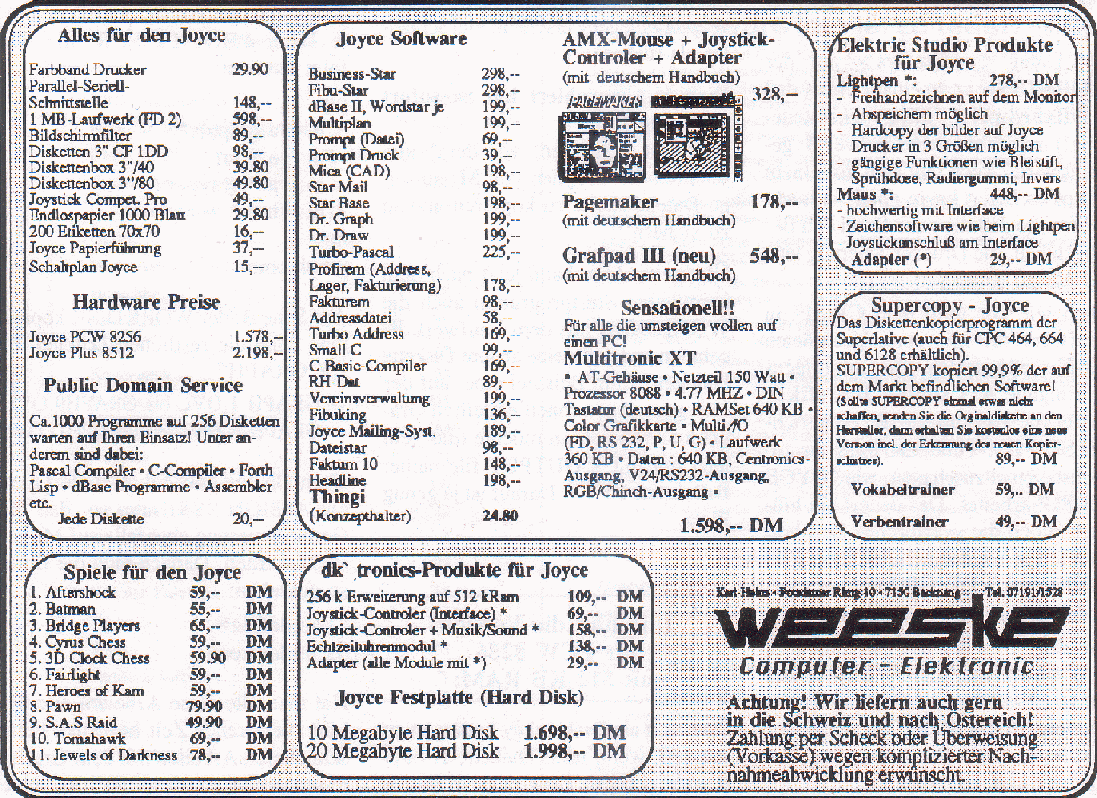 Find here some examples from a list of prices offered 1987 by the German company Weeske, selling software and equipment for the Joyce in those days.